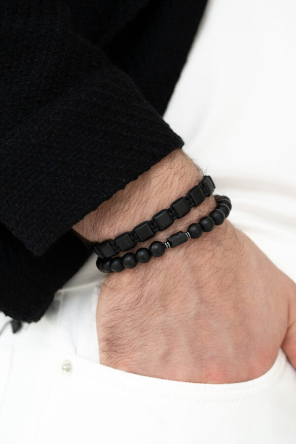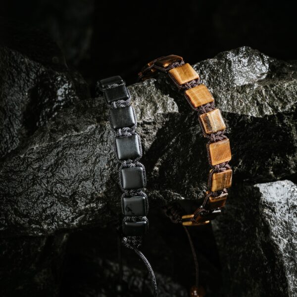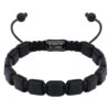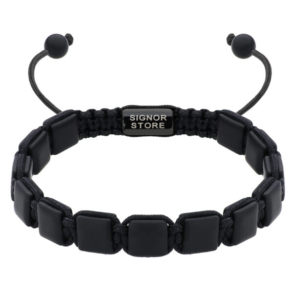 Dieses Armband wurde aus glatten schwarzen Achatsteinen an einer robusten, verstellbaren Kordel aufgereiht. Die matte Oberfläche und die einheitliche Form verleihen ihm ein modernes, minimalistisches Aussehen. Das Armband besticht durch seine präzise Verarbeitung und einen subtilen Akzent in Form eines Stahlspacers mit eingraviertem Logo auf der Rückseite.