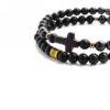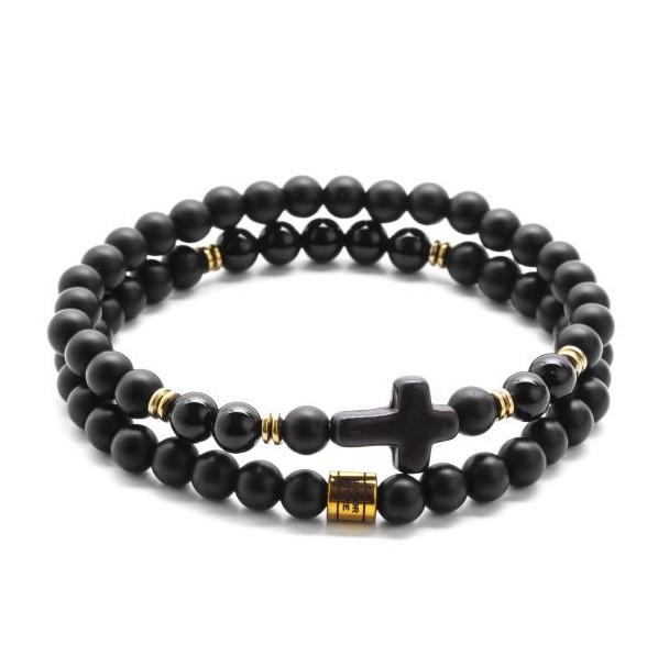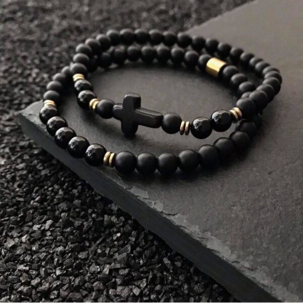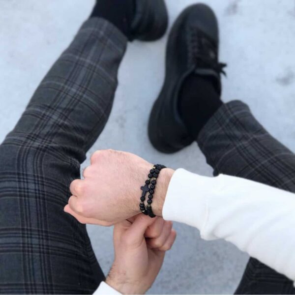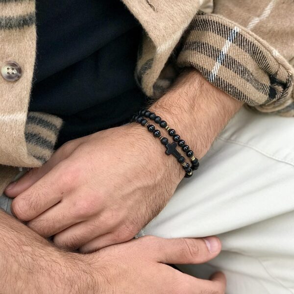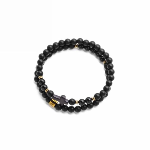 Dieses Set besteht aus zwei separaten Armbändern, gefertigt aus matten Perlen aus Black Stone und Onyx in tiefen Schwarztönen. Jedes Armband wird durch goldene Akzente aus Hämatit sowie ein Kreuz-Detail ergänzt, was dem Set eine elegante und zugleich moderne Ausstrahlung verleiht. Die Armbänder können entweder zusammen als harmonisches Ensemble oder einzeln getragen werden – je nach Outfit und Anlass.