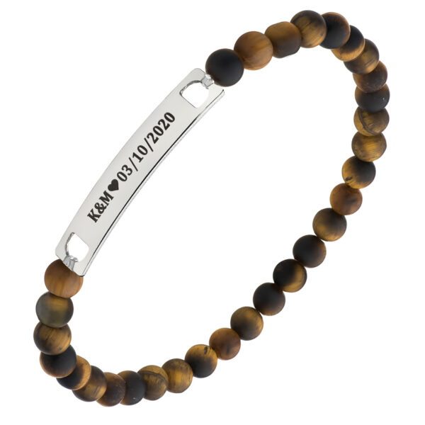 Das Tigerauge Steinarmband bietet Ihnen die Möglichkeit, eine Gravur auf der Stahlplatte anzubringen. Die Gravur erfolgt mit einer hochmodernen Lasergravurmaschine für außergewöhnliche Präzision und Haltbarkeit. Fügen Sie Ihre Initialen, ein wichtiges Datum oder einen kurzen Text hinzu, um Ihrem Armband einen einzigartigen Charakter und eine persönliche Bedeutung zu verleihen.
