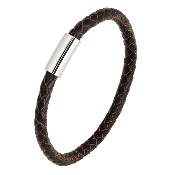 Die Form dieses braunen Lederarmbands für Herren besticht durch seine Schlichtheit, während das fein geflochtene Geflecht zu seinem einzigartigen Look beiträgt. Die Stahlschließe mit Magnet sorgt für einen sicheren Halt am Handgelenk. Es ist in drei verschiedenen Größen erhältlich und gibt Ihnen die Freiheit, es an Ihre Vorlieben anzupassen.
