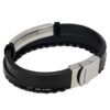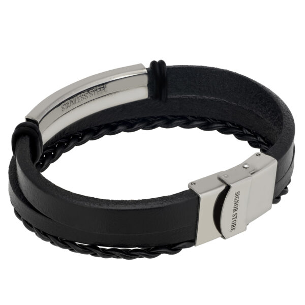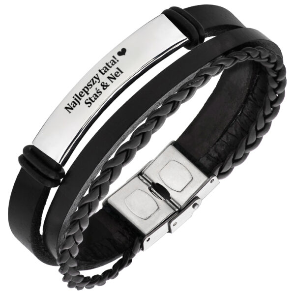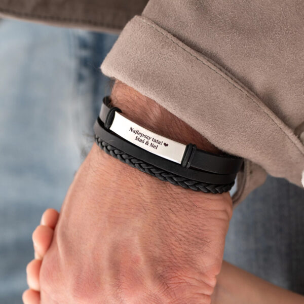 Das Armband besteht aus drei schwarzen Lederbändern: zwei glatte und ein geflochtenes, was eine kohärente und dynamische Komposition ergibt. In der Mitte befindet sich eine silberne Stahlplatte, auf der Sie Ihre individuelle Gravur anbringen können - von einem Namen bis zu einem wichtigen Datum oder einem Slogan. Um die Platte stabil zu halten, wurde sie auf beiden Seiten mit Silikonstoppern befestigt, damit sie beim Tragen nicht verrutscht.