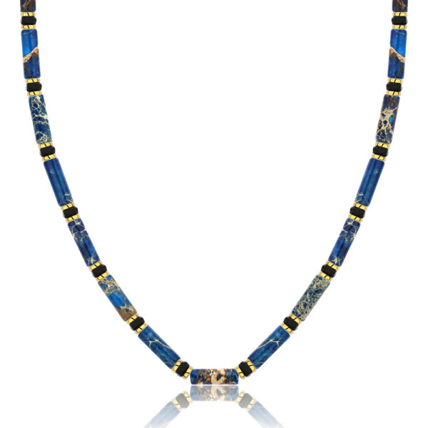Diese Halskette aus kaiserlichem Jaspis, goldenem Hämatit und Sodalith ist ein einzigartiges Accessoire, das ein einzigartiges Design mit der tiefen Symbolik der Natursteine verbindet. Das Hauptelement dieser Halskette sind Steine aus kaiserlichem Jaspis, die sich durch ihre charakteristische zylindrische Form auszeichnen - Stöcke. Diese Steine beeindrucken nicht nur durch ihre ungewöhnliche Form, sondern auch durch ihre einzigartige Farbe, die der Halskette ein Element natürlicher, roher Eleganz verleiht. Diese Halskette wird mit größter Sorgfalt handgefertigt, wodurch jedes Stück einzigartig und unwiederholbar wird.