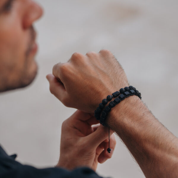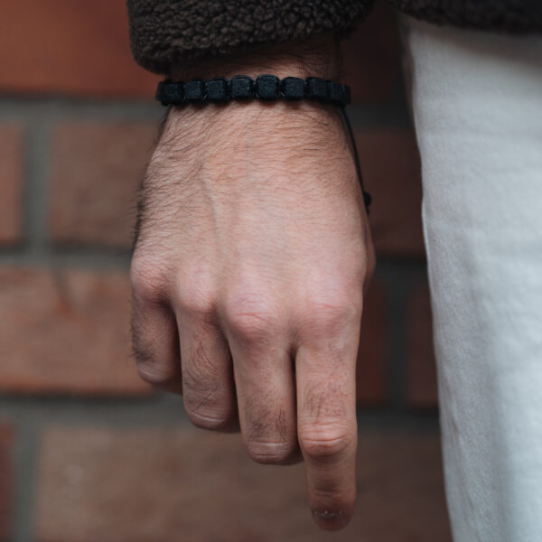 Dieses einzigartige Herrenarmband aus vulkanischen Lavasteinen ist eine Kombination aus würfelförmigen Steinen mit einem Durchmesser von 6 mm, die auf einer verstellbaren gewachsten Kordel gefasst sind und nicht nur ein einzigartiges Design, sondern auch Langlebigkeit garantieren.