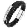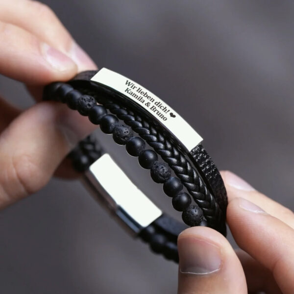 Das Armband besteht aus drei Elementen: zwei Lederriemen und einem Abschnitt mit Steinen, die auf einem robusten Seil aufgereiht sind. Die Komposition ist in Schwarztönen gehalten, während die Edelstahleinfassungen eine elegante silberne Farbe haben. Der zentrale Teil ist eine Stahlplatte für eine Gravur - Sie können einen Namen, ein Datum oder ein wichtiges Motto darauf anbringen.