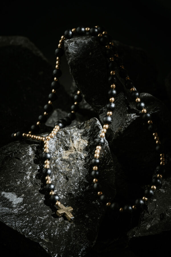 Diese exklusive Rosenkranz-Halskette besteht aus matten Steinen, die ihr einen subtilen und doch einzigartigen Charme verleihen. Feiner Hämatit vervollständigt die Komposition und sorgt für einen einzigartigen visuellen Effekt. Das ganze Stück ist mit zarten Goldelementen verziert, die einen Hauch von Luxus verleihen.