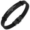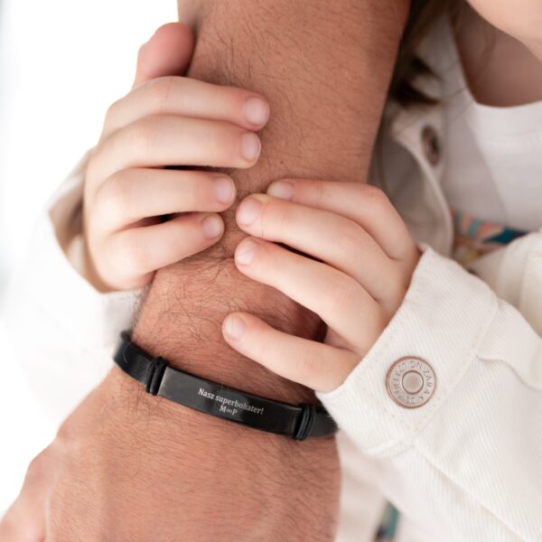 Das Armband besteht aus drei schwarzen Lederbändern: zwei glatte und ein geflochtenes, was eine kohärente und dynamische Komposition ergibt. In der Mitte befindet sich eine silberne Stahlplatte, auf der Sie Ihre individuelle Gravur anbringen können - von einem Namen bis zu einem wichtigen Datum oder einem Slogan. Um die Platte stabil zu halten, wurde sie auf beiden Seiten mit Silikonstoppern befestigt, damit sie beim Tragen nicht verrutscht.