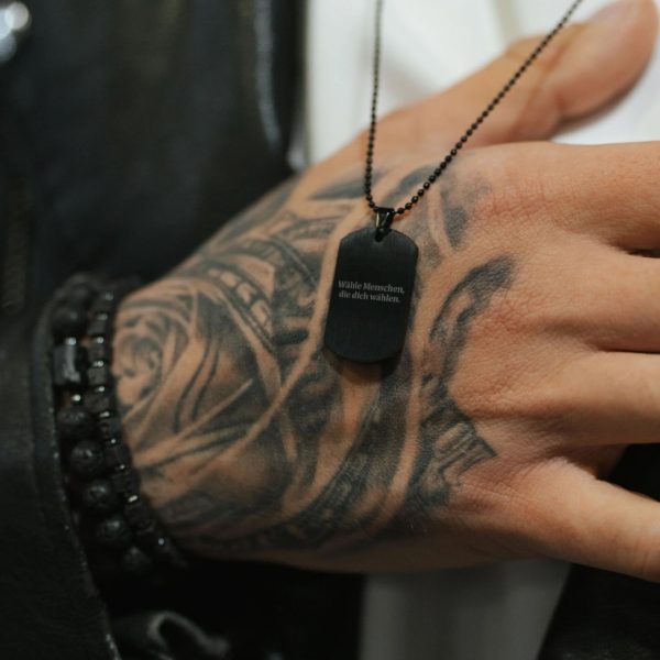 Diese minimalistische Halskette ist eine moderne Interpretation der klassischen Immortelle - die Stahlplatte und die Kugelkette erinnern an militärische Abzeichen, die heutzutage vor allem als symbolischer Schmuck dienen. Die Möglichkeit der Personalisierung macht sie zu einem einzigartigen Geschenk, das eine persönliche Botschaft enthält.