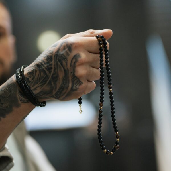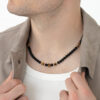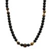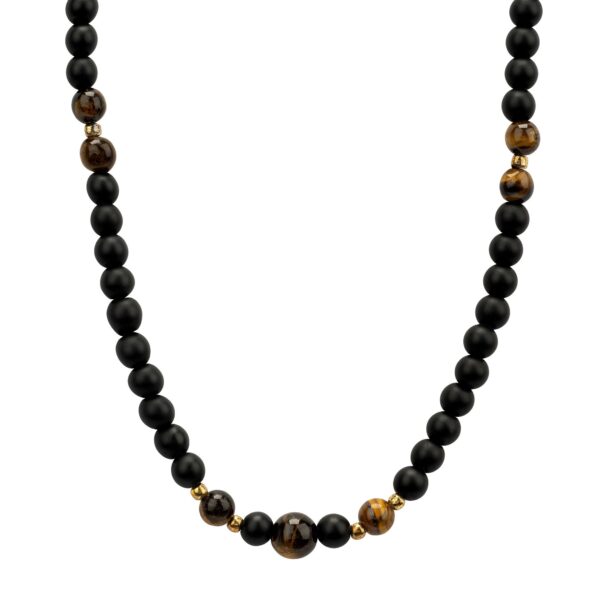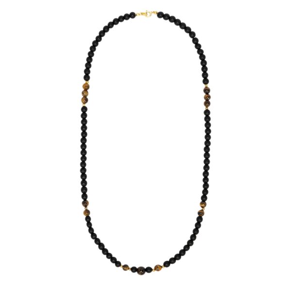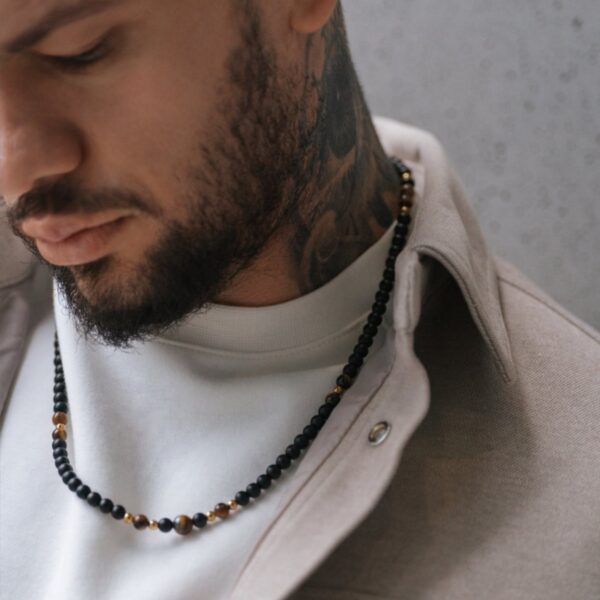 Eine einzigartige, handgefertigte Edelstein-Halskette für Herren, die die Eleganz von mattschwarzen synthetischen Steinen und die Raffinesse des Tigerauges kombiniert, ergänzt durch kostbare Perlen aus vergoldetem Sterlingsilber. Jedes Stück wurde auf einer professionellen Juwelierlinie aufgezogen, die Langlebigkeit und Widerstandsfähigkeit gegenüber verschiedenen äußeren Faktoren garantiert. Das Material ist abriebfest und die Halskette ist mit einem Verschluss versehen, der ein Ausdehnen ausschließt.