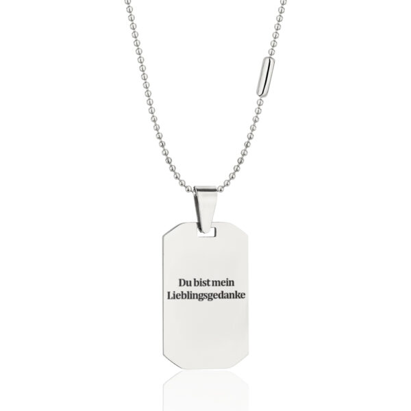 Die Immortelle ist ein zeitloses Accessoire in Form einer rechteckigen Platte mit charakteristisch abgeschrägten Ecken. Die Halskette hängt an einem Stahlband und einer Stahlkugelkette, die Sie selbst kürzen können. Die Oberfläche der Halskette kann individuell mit einem Text, einem Datum, einem Symbol oder einer wichtigen Nachricht graviert werden, was die Halskette zu einem einzigartigen, persönlichen Akzent macht.