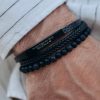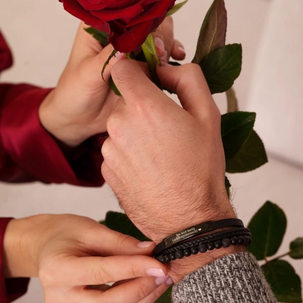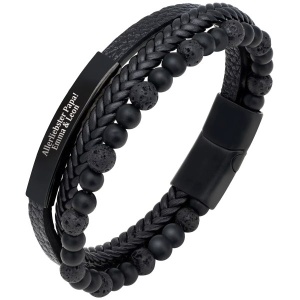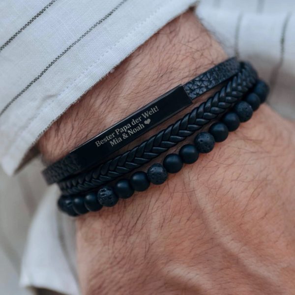 Das Armband besteht aus drei Elementen: zwei Lederbändern und einem Abschnitt mit auf ein robustes Band gefädelten Steinen. Das gesamte Design ist in klassischem Schwarz gehalten und mit Edelstahlelementen veredelt. Der Mittelpunkt des Herrenarmbands ist eine Stahlplatte, die individuell graviert werden kann – zum Beispiel mit einem Namen, einem Datum oder einem für dich bedeutungsvollen Zitat.